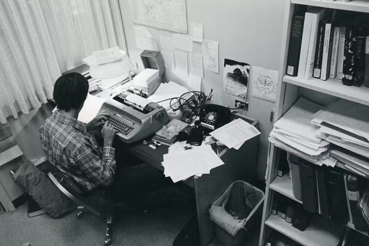 What you wouldn’t likely have conjured is an image of an adult man or woman (still wearing glasses) surrounded by telephones, typewriters, documents, and books, and embedded within a prestigious Southern Californian scientific laboratory, studying highly modern people (scientists!) dressed quite similarly to the anthropologist.